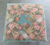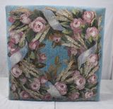 Savonnerie comprenant une couronne de fleurs (roses, pivoines, feuilles vertes) à 4 tores blanc / transparents sur fond bleu. Clous touchants sur la ceinture.