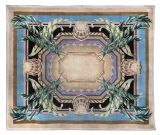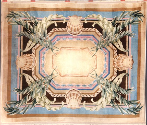 Fond beige, médaillon rectangulaire à coins coupés, draperies stylisées, bordure rose et bleue, feuilles, rubans, encadrement palmes vert d'eau stylisées sur fond brun. Bordure marron clair et beige.