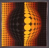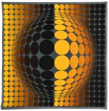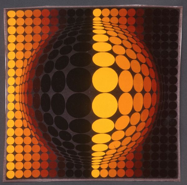 Sur fond gris foncé se détachent des cercles jaunes bruns et noirs plus grands à la partie centrale.