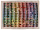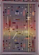 Composition abstraite formée de bandes parallèles multicolores et de petits motifs géométriques. Le tout très coloré sur fond noir.