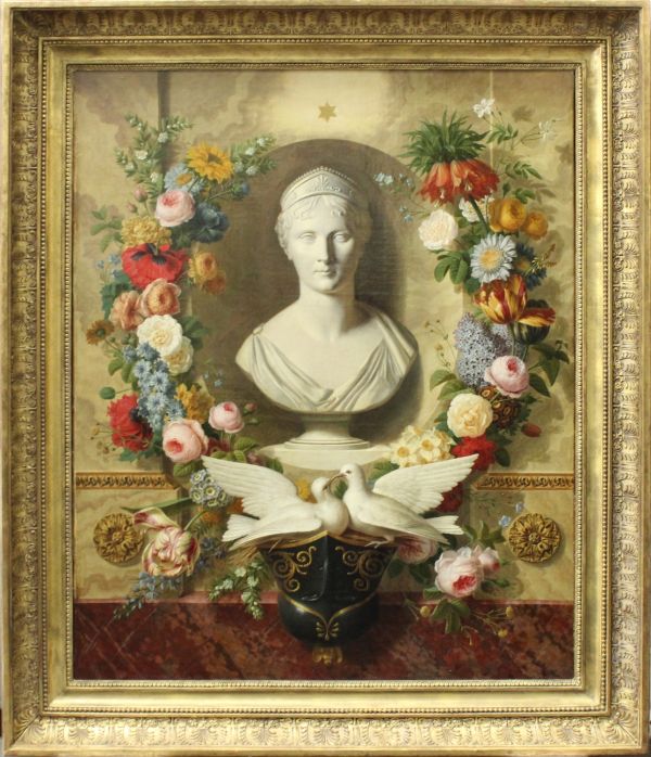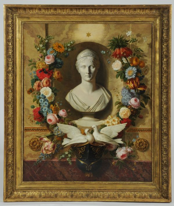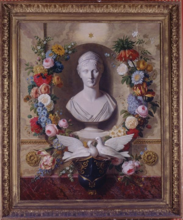 D'après une esquisse d'Anicet-Charles-Gabriel Lemonnier (Rouen, 1743 - Paris 1824), elle-même inspirée d'un buste de Marie-Louise par le sculpteur Bosio exposé au salon de 1810. Carton transformé en portrait de l'impératrice de Russie Marie Alexeievna au début de la Seconde Restauration, puis en portrait de Joséphine d'après son buste en biscuit de Sèvres du modèle de Chaudet sous le Second Empire. Forme paire avec le portrait de Napoléon (GOB 171).