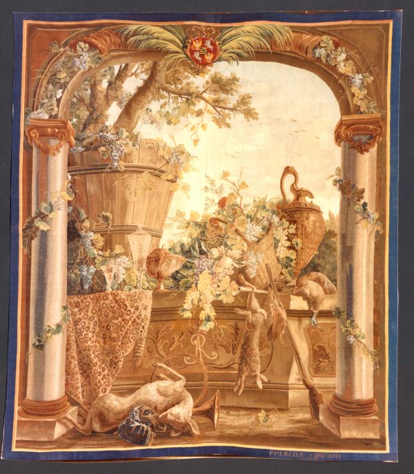 Nature morte encadrée par deux colonnes ioniques, représentant l'automne (panier de raisin et fleurs, trophée de chasse symbolisée par lièvre, oiseau, chevreuil, cor de chasse et fusil, cuvier de raisin, orfèvrerie, coupe en cristal, d'après Dubuisson)