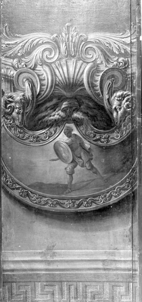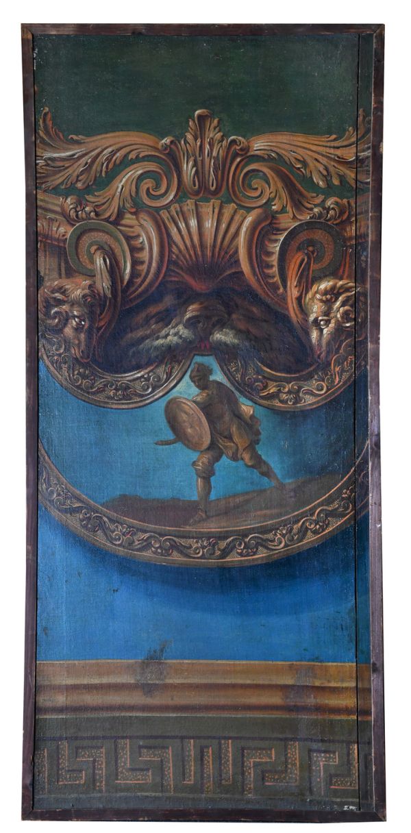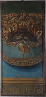 Partie centrale de la console d'ornement qui, dans la Tenture de Don Quichotte, soutient le cadre intérieur où prend place le sujet historié. La figure d’un guerrier se détache du contrefond bleu. Une frise de grecque se déploie sur la bordure inférieure, au-dessous d’un cartouche laissé nu, destiné à l’inscription du sujet.