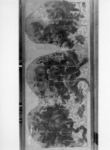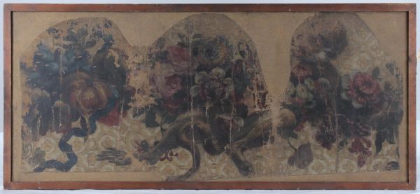 Trois fragments de guirlandes de fleurs sur fond de mosaïque jaune. Les pattes d’un singe ainsi que la tête et l’aile déployée d’un oiseau se distinguent dans la composition centrale.