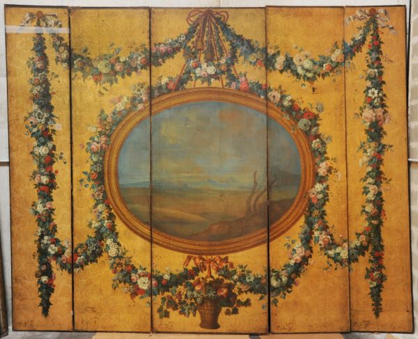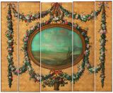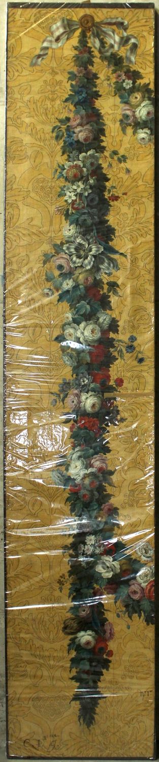 Les compositions répondent à un principe identique. Au centre, un cordon rouge retient un faux encadrement de bois doré. À la suspension de ce médaillon fait écho celle d’un panier chargé de fruits d’automnes – pommes, poires, raisins – et, surtout, celle des riches guirlandes de fleurs savamment retenues par des rubans à des patères et se déployant dans un élégante symétrie. Le fond jaune imitant le damas se substitue à celui rose vif des précédents tissages.