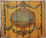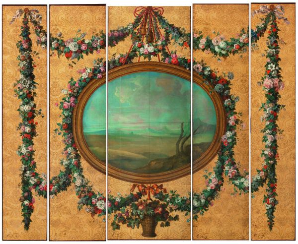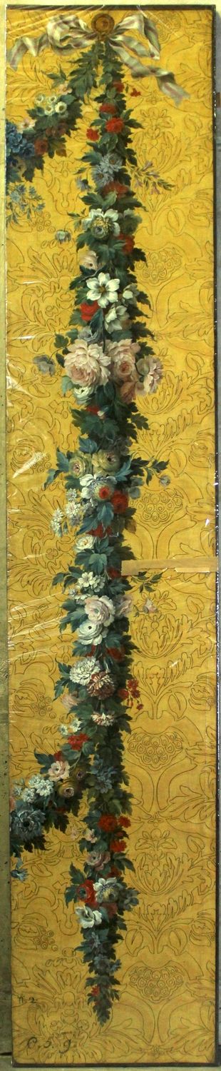 Les compositions répondent à un principe identique. Au centre, un cordon rouge retient un faux encadrement de bois doré. À la suspension de ce médaillon fait écho celle d’un panier chargé de fruits d’automnes – pommes, poires, raisins – et, surtout, celle des riches guirlandes de fleurs savamment retenues par des rubans à des patères et se déployant dans un élégante symétrie. Le fond jaune imitant le damas se substitue à celui rose vif des précédents tissages.