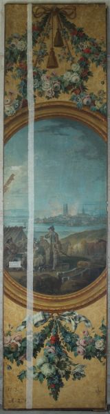 Partie centrale pour l'une des copies de la tenture de Don Quichotte, avec un médaillon tronqué à ses deux extrémités droite et gauche. En son centre est représenté un campement de soldat, avec un homme debout, appuyé sur son fusil, au premier plan ; à l'arrière-plan, une ville se dessine. Dans la partie supérieure, une guirlande de fleurs maintenues par des pampilles ; en partie inférieure, une guirlande retenue par des rubans bleu et blanc.