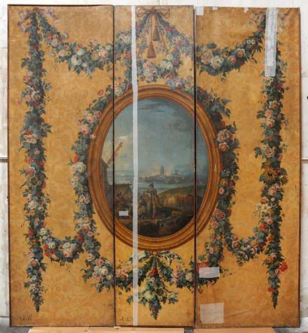 Tessier conçut quatre cartons de même hauteur (« 10 pieds 10 pouces ») mais de largeur différente, découpés en trois, cinq ou sept lés pour faciliter le travail des liciers. Deux cartons de « 9 pieds 8 pouces de long », format correspondant à la présente œuvre, sont mentionnés dans les mémoires des paiements des Gobelins, l’un en 1772 (« Modèle de Tessier… exécuté pour les tableaux moyens, avec un cadre ovale au milieu… le tout sur un fond de damas jaune imitant l’étoffe de soie »), l’autre en 1774, chacun payés 2000 livres (Fenaille, 1923, p. 261).