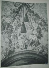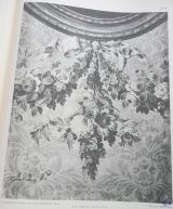 Les compositions répondent à un principe identique. Au centre, un cordon rouge retient un faux encadrement de bois doré. À la suspension de ce médaillon fait écho celle d’un bouquet renversé, attaché au cadre par le truchement d’un anneau, et de riches guirlandes de fleurs, savamment retenues par des rubans à des patères et se déployant dans un élégante symétrie. Le fond jaune imitant le damas se substitue à celui rose vif des précédents tissages.