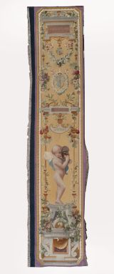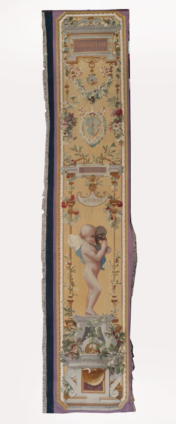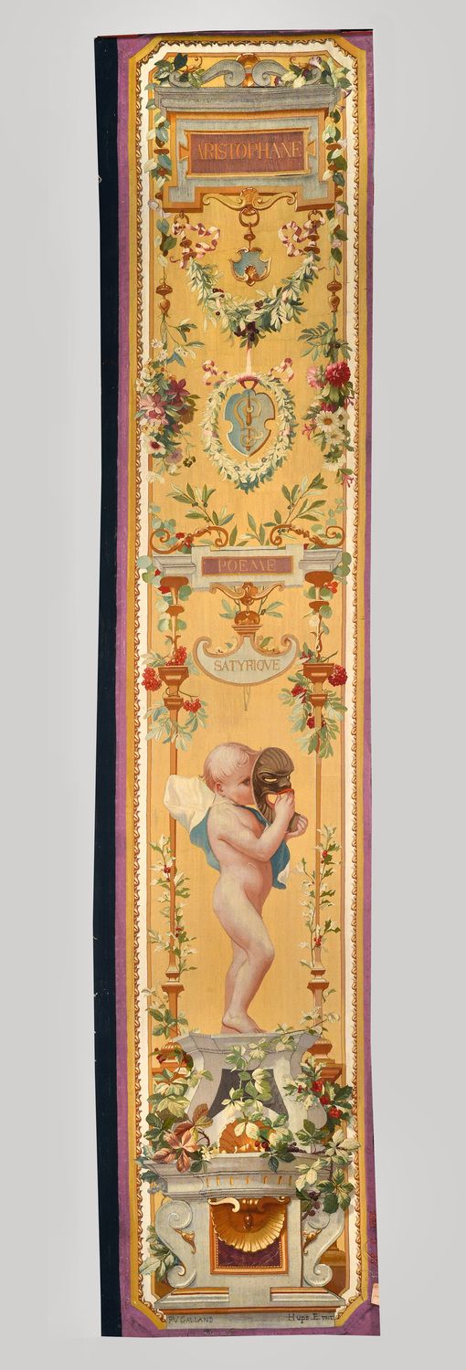D'un ensemble de dix-neuf panneaux de tapisserie exécutés d'après des cartons commandés à Pierre-Victor Galland en 1876 sur le thème "salon des poèmes" et destinés à orner l'ancien cabinet de travail de l'impératrice Eugénie au palais de l'Elysée. La tenture a réintégré le Mobilier national en 1949 lors de la l'aménagement d'appartement pour les chefs d'Etat étrangers au premier étage de l'Elysée.
