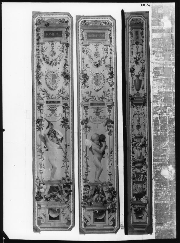 La composition des trumeaux est structurellement identique et se distingue par le détail des feuillages et des fleurs. La différence principale réside dans la pose des enfants et dans les attributs qui les caractérisent. Pour le Poème Satyrique (Aristophane), l'enfant est de profil et est tourné vers la gauche. Il tient sur son visage un masque comique.