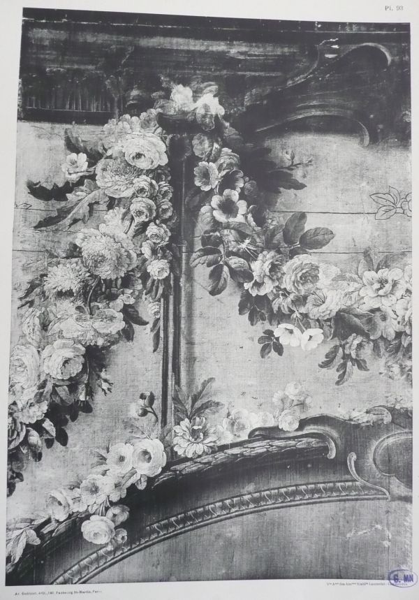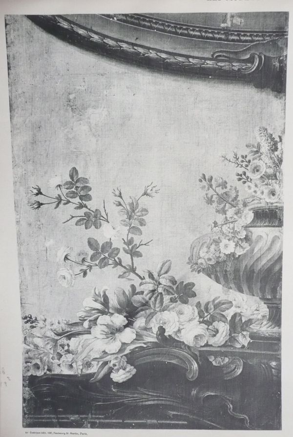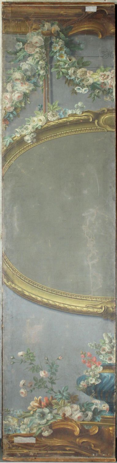 Les deux œuvres furent respectivement payées 2 000 et 1 600 livres au peintre, une somme élevée que justifie leur extraordinaire qualité. Maurice Jacques déploie en effet tout son talent dans la description minutieuse et sensible des fleurs, réunies en gerbes aux angles inférieurs, jaillissant du vase en bouquet, suspendues en guirlandes ou donnant l’illusion de s'épanouir derrière le cadre. À peine esquissée à l’arrière-plan, le dessin d’une architecture portée par de fines colonnettes rappelle l’alentour projeté par l’artiste pour le fond du lit du comte de Lillebonne (GOB-246-001). La riche mouluration de la bordure extérieure témoigne encore des caprices de l’art rocaille tandis que les formes assagies du médaillon central et, surtout, le motif du vase avec sa frise de grecques, constituent des manifestations précoces du goût néoclassique.