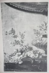 « Un tableau de 12 pieds de haut sur 11 pieds 10 pouces de large [GOB-189-001 à 004], orné d'une moulure avec ses bordures très riches, peintes et feintes en or imitant la sculpture, sur laquelle bordure est un groupe de fleurs en guirlandes. Et en assise sur le bas de ladite bordure sont groupées des fleurs pour accompagner un Vaze imitant le lapis aussi enrichi de fleurs peintes en coloris. Dans le milieu du susdit tableau est représentée une bordure ovalle peinte et feinte en or vert ornée de fleurs peintes en coloris : cet alentour est composé et orné de façon à pouvoir recevoir des tableaux […]