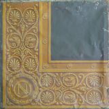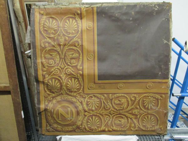 Sur un fond jaune se détachent des rinceaux, des palmettes et des têtes d'aigles. Dans une couronne de laurier, la lettre N.