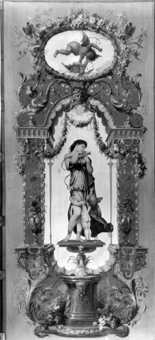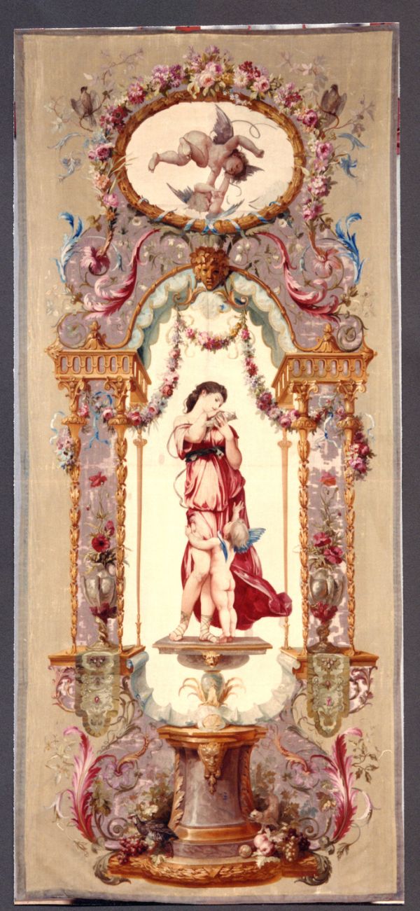 Inspirée des "Portières des dieux" de Claude (III) Audran, où l'élément décoratif domine, elle est considérée comme la seule tenture moderne tissée sous le Second Empire.