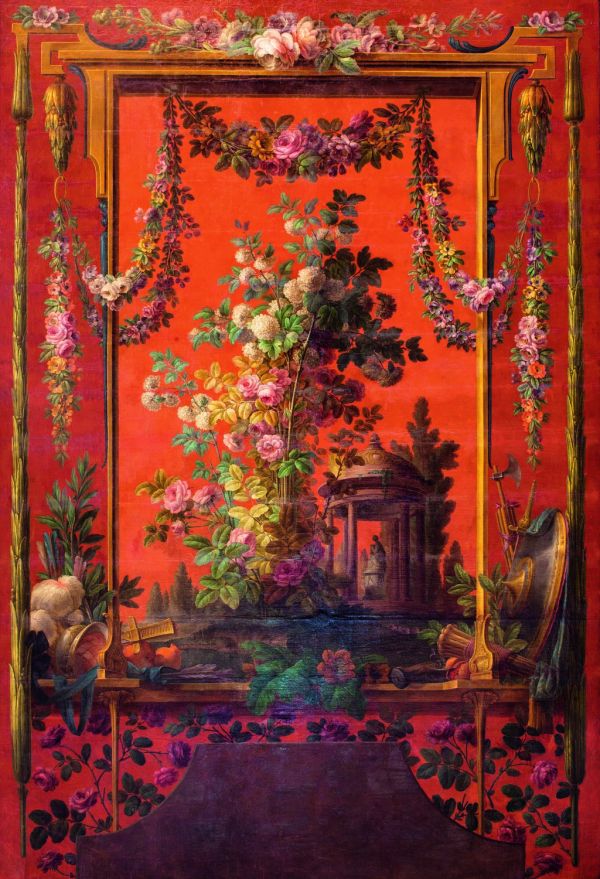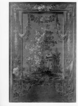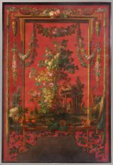 Un mémoire de 1770 décrit ce modèle de fond de lit comme « un tableau de 9 pieds ½ de haut sur 7 pieds ½ de large représentant une composition de fantaisie, savoir des ornements de différentes couleurs, des fleurs, de l’architecture, des trophées de guerre et autres accessoires » (Les Gobelins au siècle des Lumières, cat. exp., 2014, p. 336).