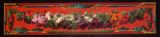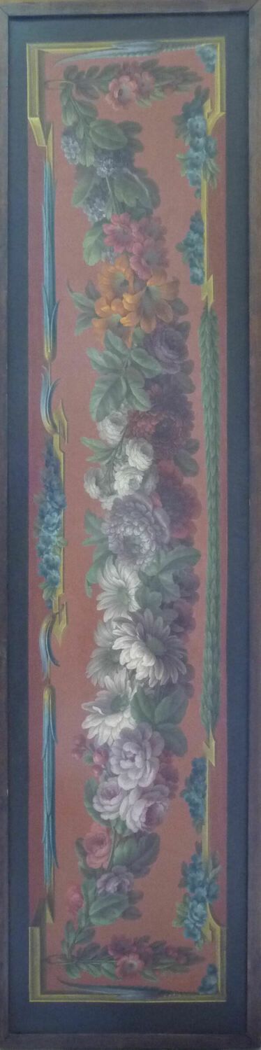 Guirlande de fleurs sur fond rouge ; l'alentour est constitué de fleurettes et de tores laurés retenus par un encadrement feint.