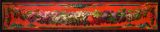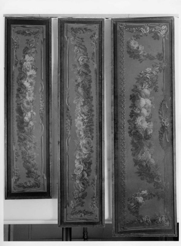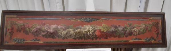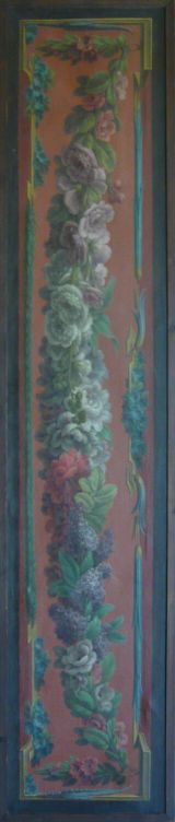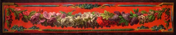 Guirlande de fleurs sur fond rouge ; l'alentour est constitué de fleurettes et de tores laurés retenus par un encadrement feint.