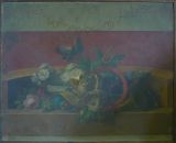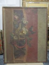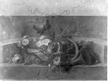 Trophée de chasse agrémenté de fleurs (lilas, renoncules...), comprenant un cor, une dague, un ceinturon de vénerie...