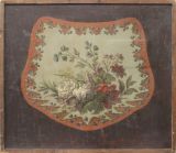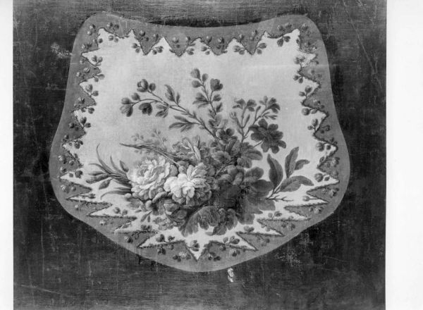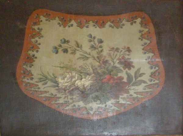 MANUFACTURE NATIONALE DES GOBELINS / INVENTAIRE GENERAL : N° // INVENTAIRE SPECIAL / N° 249 (27) / Copie de M Rigaud d'après Jacques / Siège de chaise. Fleurs sur fond gris, bordure / en zig-zag sur fond rose / Hauteur 0,73 // Largeur 0,84