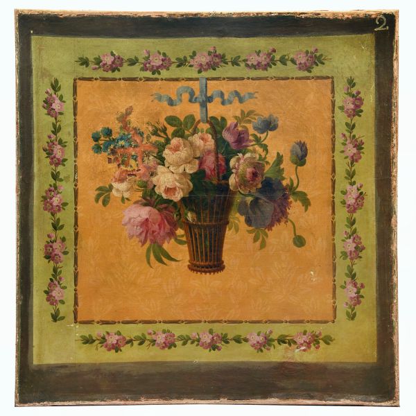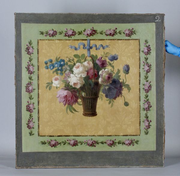 Un panier de fleurs suspendu par un ruban bleu se détache sur un fond de faux damas jaune. Séparée par une frise de grains fleuronnés et de perles, la plate-bande présente une guirlande de fleurettes roses (becs de héron ?) sur un fond vert, encadrant gracieusement la composition centrale.
