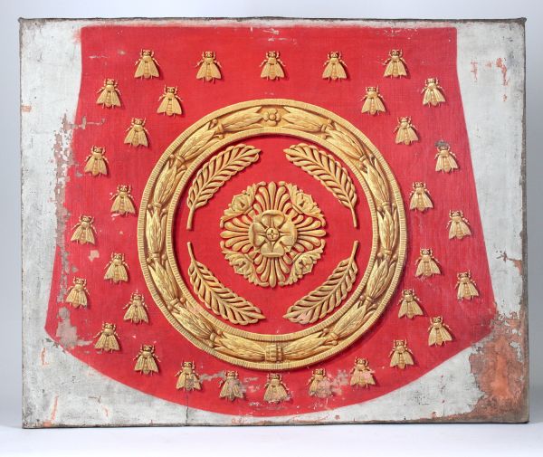 Sur le fond rouge se détache une rosace or entourée de 4 parlmes inscrite dans une couronne de laurier. Semis d'abeilles or.