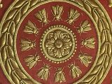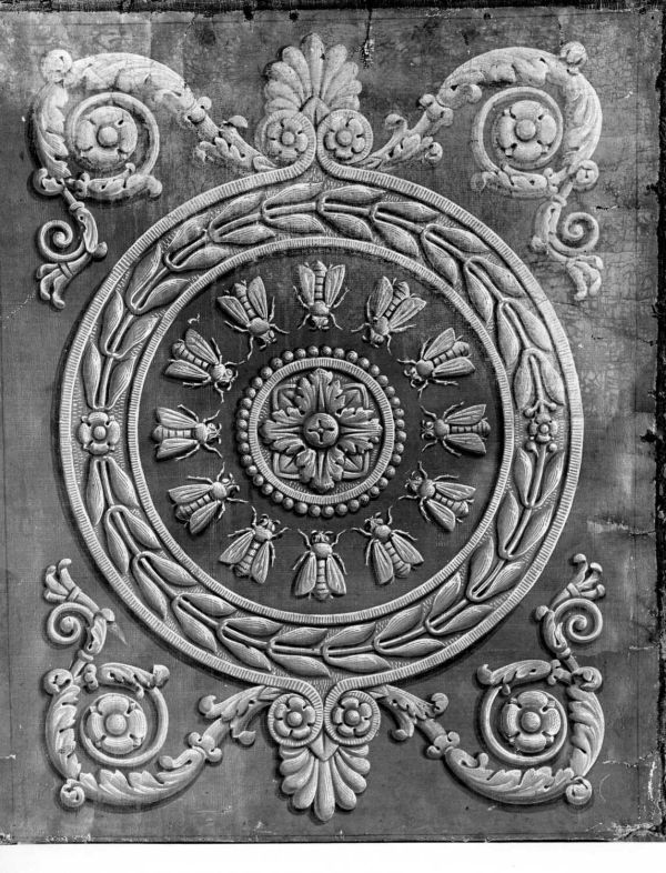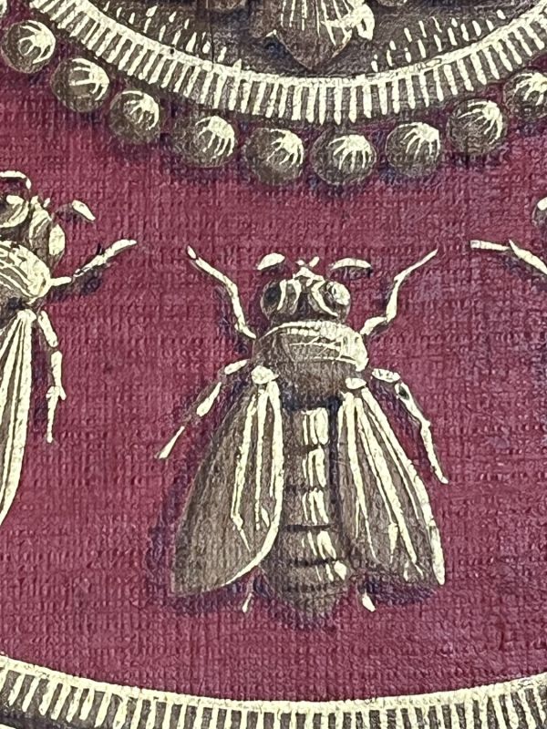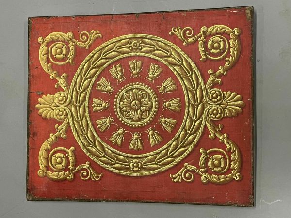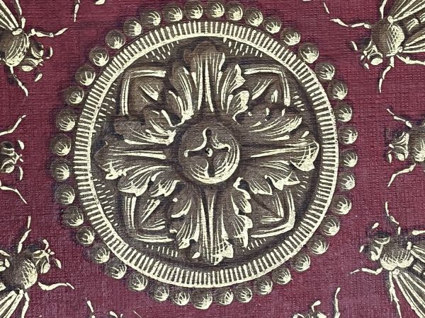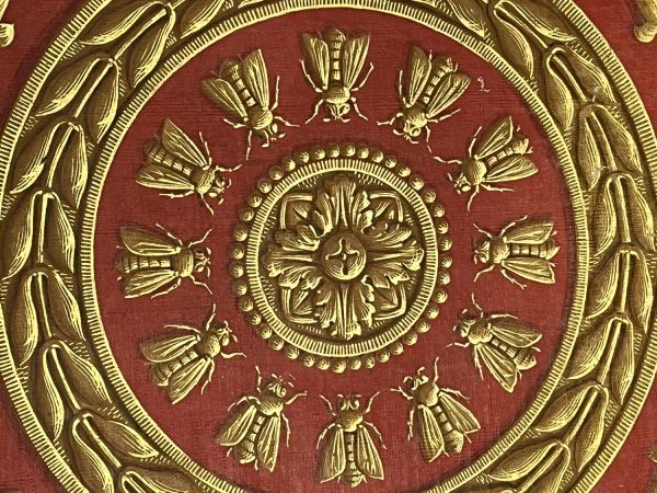 Sur un fond rouge se détache une rosace or et des abeilles inscrites dans une couronne de feuilles de laurier entourée de rinceaux et de palmettes