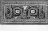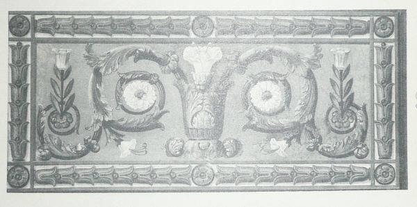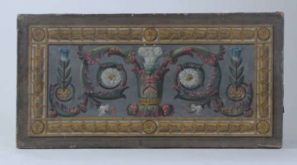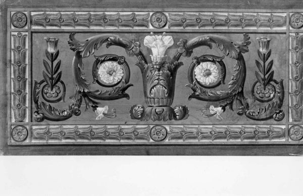 Modèle de joue de causeuse sur fond gris : décor de rinceaux en volutes symétriques aboutissant à des fleurs et se rejoignant au centre par une feuille d'acanthe en culot surmontée d'une fleur blanche. La composition est entourée d'une frise de culots sur fond blanc, interrompue par des médaillons aux angles.