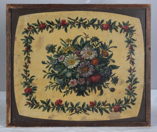 Modèle pour la garniture du fond d’un tabouret de pied présentant sur un fond crème une riche composition de fleurs variées encadrée par une guirlande de fleurs de grenadier.