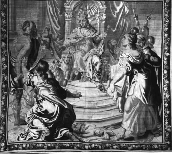 Salomon assis au centre sur un trône autour duquel sont groupés des personnages dont 2 enfants. Bordure de fleurs.