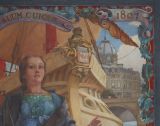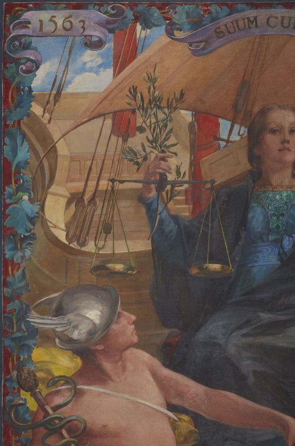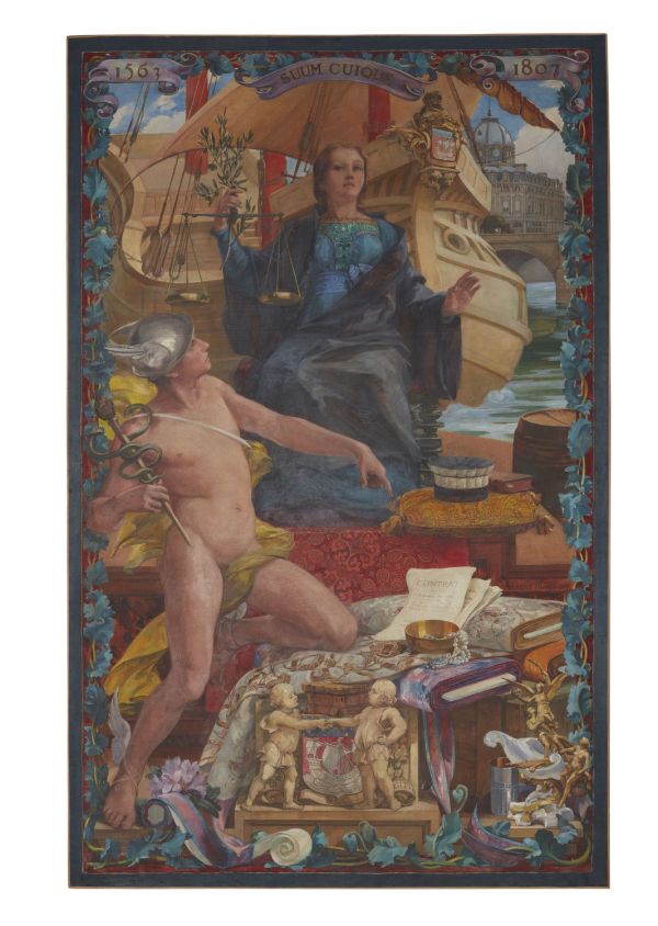 La figure de la Justice se détache sur la nef de la ville de Paris; on aperçoit le dôme du Tribunal de commerce qu'elle symbolise. Au premier plan, à gauche, Mercure, dieu du commerce dans la mythologie romaine. Les dates de 1563 et 1807 qui encadrent la devise "Suum quique" correspondent à gauche, à celle de l'édit de Charles IX pour le fonctionnement de la justice et à droite, à celle de la promulgation du code du commerce.