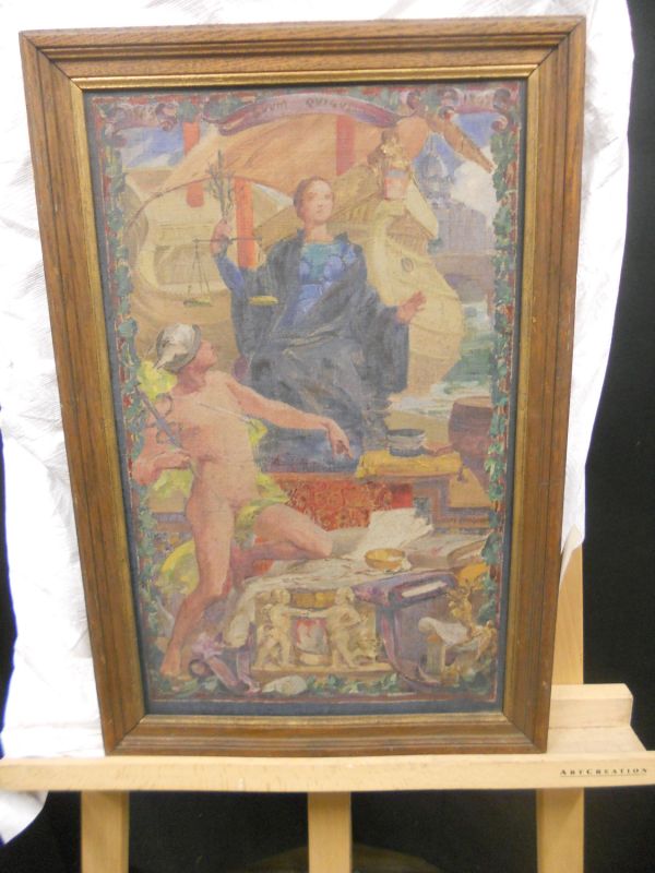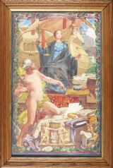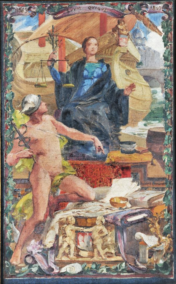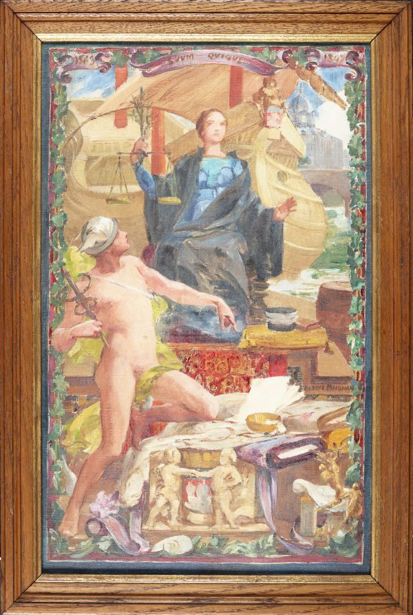 Commande à Albert Maignan (1845-1908), pour une cheminée de la salle des délibérations du conseil du tribunal de commerce de la Seine, où la tapisserie est toujours accrochée.