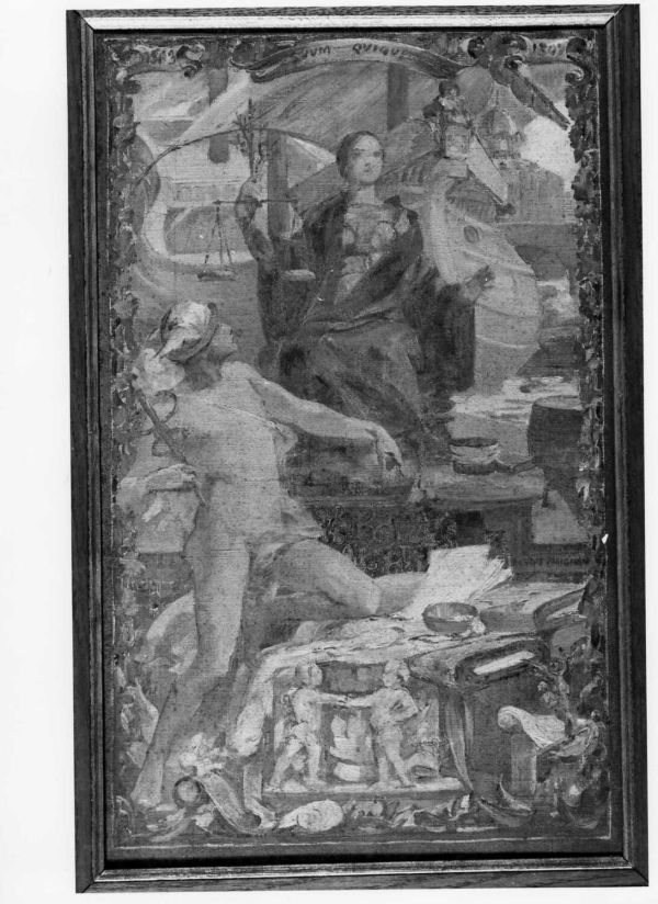 La figure de la Justice se détache sur la nef de la ville de Paris; on aperçoit le dôme du Tribunal de commerce qu'elle symbolise. Au premier plan, à gauche, Mercure, dieu du commerce dans la mythologie romaine. Les dates de 1563 et 1807 qui encadrent la devise "Suum quique" correspondent à gauche, à celle de l'édit de Charles IX pour le fonctionnement de la justice et à droite, à celle de la promulgation du code du commerce.
