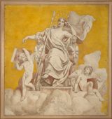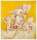 Sur un fond jaune se détache une femme casquée : un amour à ses pieds joue de l'orgue.