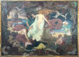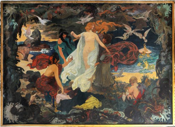 Au milieu d'une végétation aquatique et d'oiseaux se détache Vénus debout sur le sable entourée de trois femmes et d'un enfant ailé