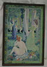 Dans une forêt au couleurs printanières, au premier plan, une femme nue est assise, vue de dos, sur une nappe de pique nique à côté d'une panier. Le sol herbeux et parsemé de fleurs blanches et jaunes. Au second plan, deux femmes, l'une vêtue d'une robe à motif blanc sur fond bleu et l'autre de vert à motifs bleus, jouent au volant. A l'arrière-plan, deux femmes nues se baignent.