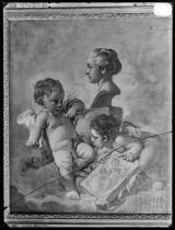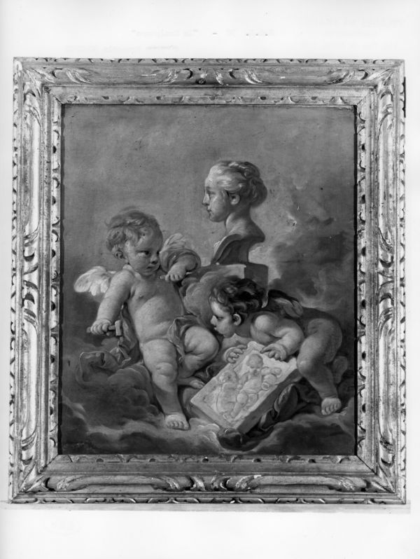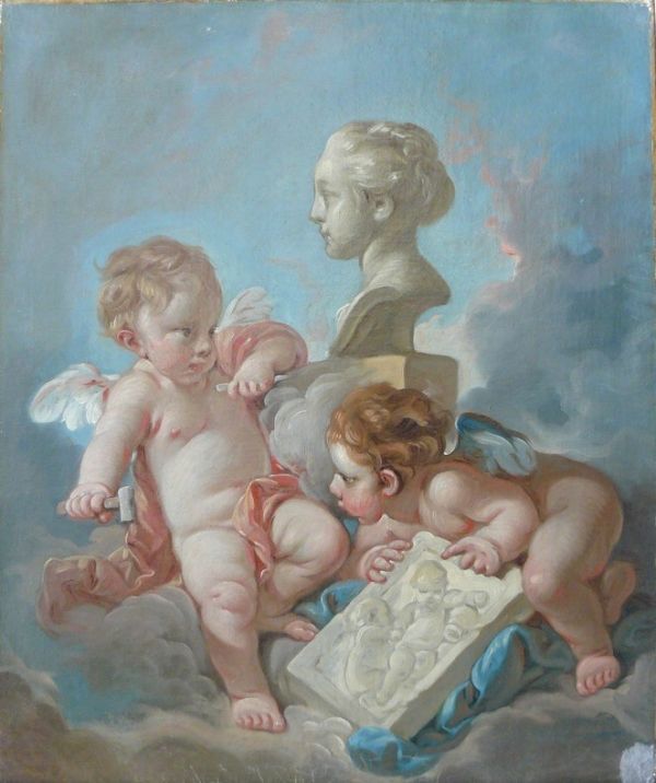 Les six modèles de dossier de cet ensemble présentent deux putti dans les nuées, accompagnés des attributs traditionnels des arts auxquels ils sont associés – ici un buste, un bas-relief, un maillet et un ciseau pour la Sculpture.