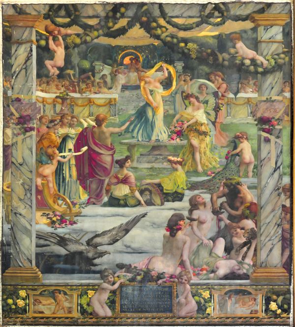 Entre deux colonnes de marbre, Jupiter, en présence des Dieux, accorde l'immortalité à Psyché. Junon, protectrice des épouses, préside au mariage de l'Amour et Psyché. Le manteau couleur safran de la jeune épouse est de tradition chez les Romains, ainsi que la présence de dix témoins qui se confondent ici avec les dieux de l'Olympe.