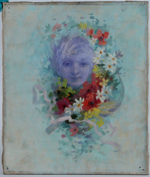 Sur un fond bleu se détache une tête de femme en camieu au milieu de coquelicots et de marguerites.