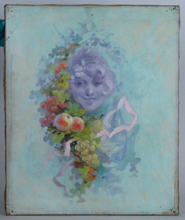 Sur un fond bleu se détache une tête de femme en camaïeu entourée de raisin, pêches et de rubans roses.