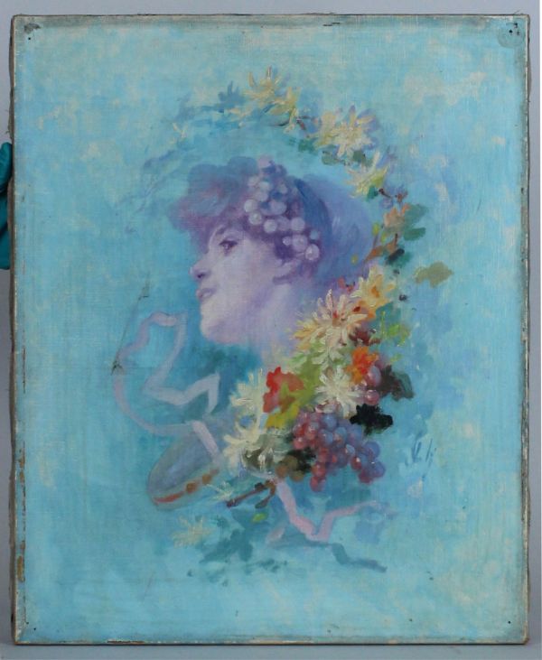 Sur un fond bleu se détache une tête de profil. Ruban, raisin, chrysanthèmes, tambourin.