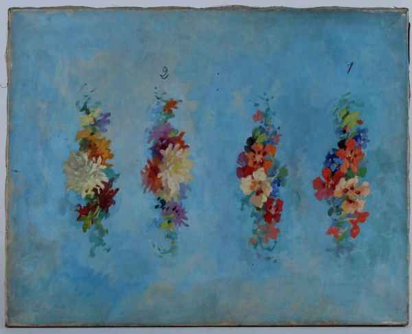Sur un fond bleu se détachent 4 motifs verticaux de fleurs.