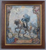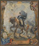 Le général Saint Martin sur un cheval blanc marchant dans un paysage naturel et montagneux. La scène centrale est encadrée de guirlandes végétales. En bas, au centre, dans un cartouche avec motifs architecturaux, l' inscription : Au Libérateur José de San Martin La République française.