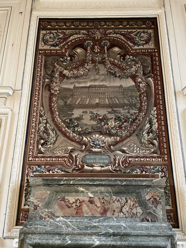 Dans un cadre circulaire central orné de têtes de bélier et garni à l'intérieur d'une couronne de feuilles de laurier, une vue du château neuf de Saint-Germain-en-Laye. Terrasses, jardins et boulingrins s'étendent jusqu'à la Seine en contrebas, où naviguent barques et bateaux. Des guirlandes de fleurs retombent sur ce cadre. Le tout est entouré par une frise d'oves et de perles de couleur bronze doré avec, en partie supérieure, deux volutes. En partie inférieure, sous le cadre, un cartouche portant l'inscription : "Le château neuf de Saint-Germain", se prolongeant de chaque côté en rinceaux.