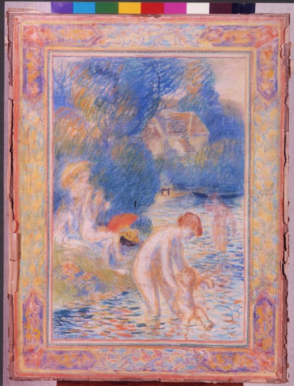 Un groupe de baigneuses prenant plaisir à se rafraîchir dans une rivière comme a pu en peindre Renoir. A l'arrière-plan, une maison dans un paysage. La bordure est garnie d'un enchevêtrement de plantes.