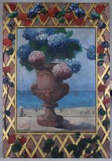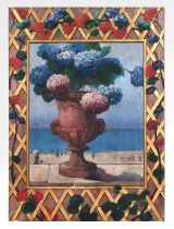 Au centre, un grand vase médicis garni de fleurs d'hortensias se découpe sur un paysage marin. Le motif principal est encadré d'un large treillage en croisillon orné de fleurs et de feuilles.