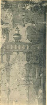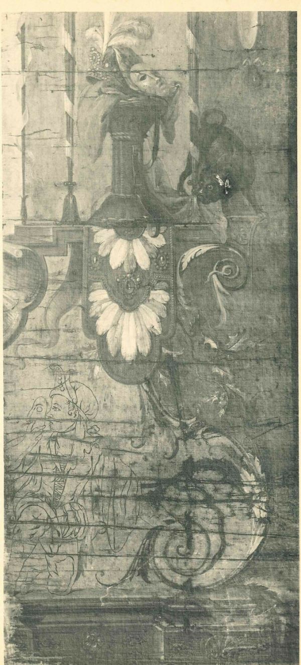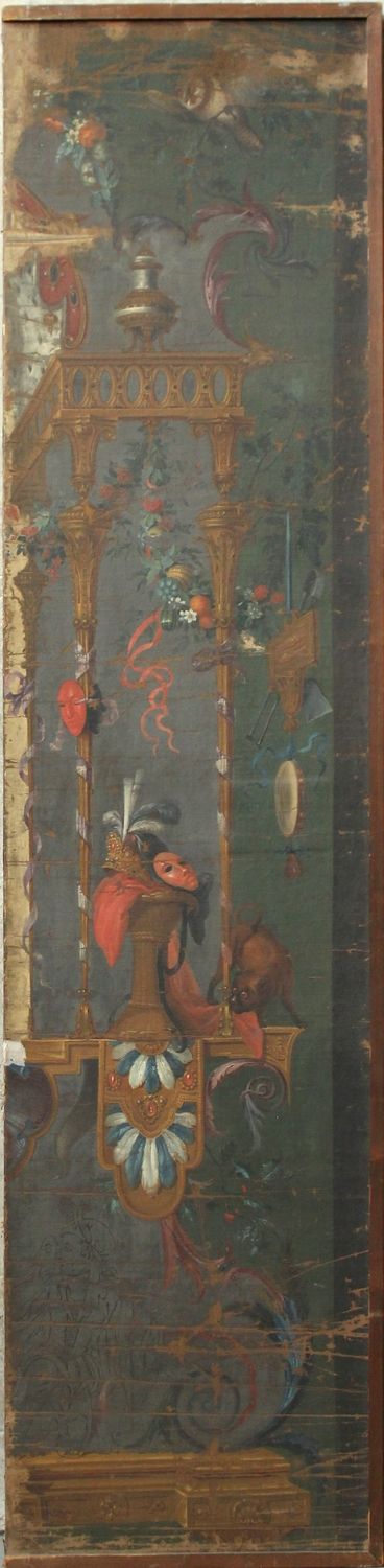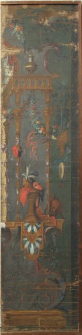 Lé droit de la Portière de Saturne (modèle de haute lisse), représentant un fragment de portique agrémenté de guirlandes de fleurs. Des masques sont disposés sur la console de l'architecture.