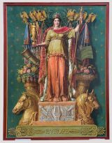 Elle se tient debout sur un socle décoré d'attibuts divers flanqué d'une tête de cheval et de taureau, à côté, des cornes d'abondance.