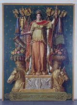 D'un ensemble de quatre cartons de tapisserie sur le thème des "Quatre parties du globe caractérisées par leurs productions naturelles et industrielles" (lettre de Denon à Daru, 16 mai 1811) destiné à être tissé pour servir à la décoration de la galerie de Diane du palais des Tuileries. Commencé en 1811, les tapisseries ne sot pas achevées à la chute de l'Empire et ne seront jamais installées Les portières, restées en magasin aux Gobelins, disparurent dans l'incendie de la manufacture le 24 mai 1871. Les quatre cartons ont été retissés de 1933 à 1935.
