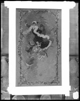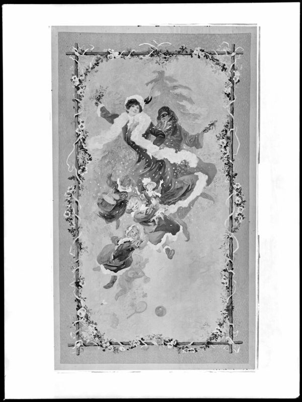 Une femme vêtue de violet vole dans un ciel de neige tenant un bouquet de houx, autour d'elle des enfants. Manufcture des Gobelins haute lilce- chef d'atelier Mr Félix- tapissiers Boudarel, Maitre, Montagnon, Roland. Signature RGF 1910.